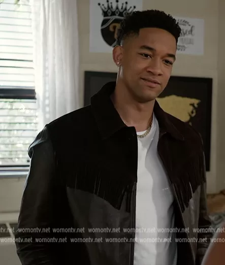 Damon (played by Peyton Alex Smith) on All American Homecoming on CWTV was spotted wearing this black fringe jacket on All American Homecoming on episode 'What Now?' (1x11) in May 2022. Damon's Jacket is the Fringed Leather Jacket by Zara.