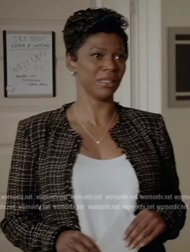 (played by ) on All American Homecoming on CWTV was spotted wearing this Black tweed jacket on All American Homecoming on episode 'What Now?' (1x11) in May 2022. 's Jacket is the Petite Fringe-Trim Tweed Jacket by Calvin Klein.