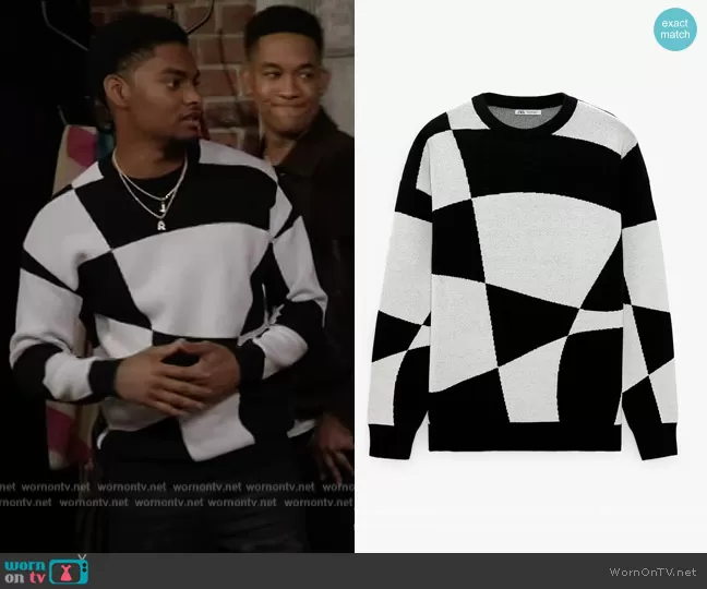JR (played by Sylvester Powell) on All American Homecoming on CWTV was spotted wearing this geometric sweater on All American Homecoming on episode 'What Now?' (1x11) in May 2022. JR's Sweater is the Geometric Jacquard Sweater by Zara.