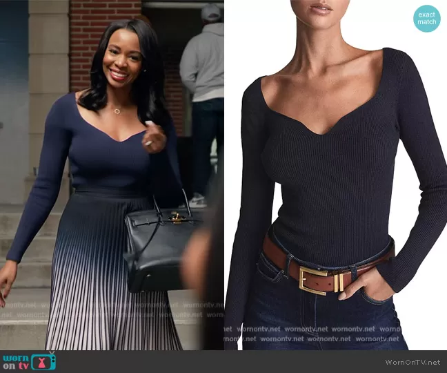 (played by ) on All American Homecoming on CWTV was spotted wearing this Navy sweetheart top and pleated skirt on All American Homecoming on episode 'Confessions' (1x12) in May 2022. 's Sweater is the Emira Ribbed Top by Reiss . 's Skirt is the Marlie Ombré Pleated Skirt by Reiss.
