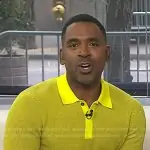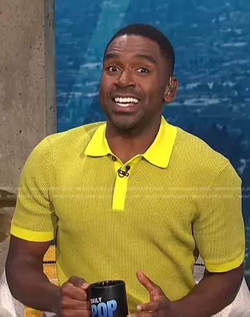Justin Sylvester on E! News on E! was spotted wearing this yellow polo shirt on E! News Daily Pop on May 31 2022's episode. Justin's Shirt is the Regular Fit Knitted Polo Shirt by Cos.