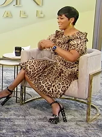 Tamron Hall on Tamron Hall Show on ABC was spotted wearing this leopard print mini dress on Tamron Hall Show on May 31 2022's episode. Tamron's Dress is the Off-the-shoulder ruffled leopard-print cotton-poplin mini dress by Dolce and Gabbana.