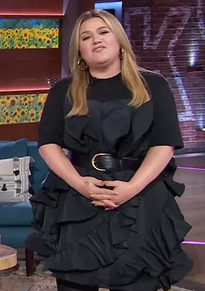 Kelly Clarkson on The Kelly Clarkson Show on NBC was spotted wearing this black ruffled mini dress on The Kelly Clarkson Show on May 31 2022's episode. Kelly's Dress is the Mixed Media Ruffle Cotton Dress by Alexander McQueen.