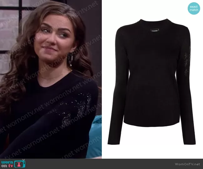 Ciara Brady (played by Victoria Konefal) on Days of our Lives on Peacock was spotted wearing this black sequin arrow sweater on Days of our Lives on Jun 02 2022's episode. Ciara's Sweater is the Miss Arrow Cashmere Sweater by Zadig & Voltaire.