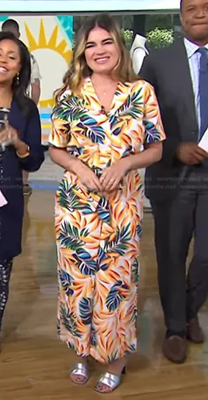 on Today on NBC was spotted wearing this leaf print jumpsuit on Today on May 31 2022's episode. 's Jumpsuit is the Tropical Print Tie-Front Jumpsuit by Tabitha Brown for Target.