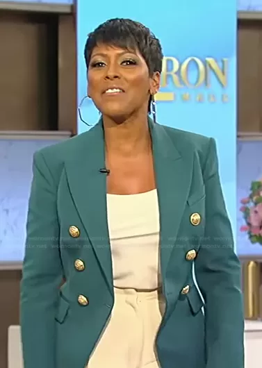 Tamron Hall on Tamron Hall Show on ABC was spotted wearing this green blazer with gold buttons on Tamron Hall Show on Jun 02 2022's episode. Tamron's Jacket is the Fitted Double-Breasted Jacket by Balmain.