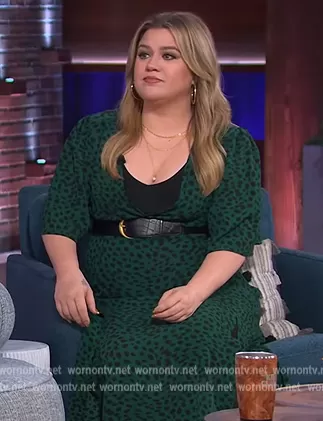 Kelly Clarkson on The Kelly Clarkson Show on NBC was spotted wearing this green spotted wrap dress on The Kelly Clarkson Show on Jun 02 2022's episode. Kelly's Dress is the Angel Sleeve Midi Dress in green animal print by ASOS.