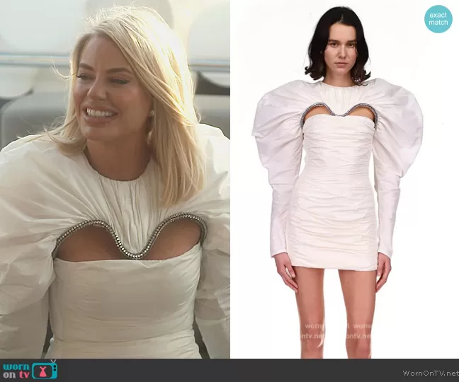Caroline Stanbury (played by Caroline Stanbury) on The Real Housewives of Dubai on BravoTV was spotted wearing this white puff sleeve embellished mini dress on The Real Housewives of Dubai on episode 'Sand Dunes and Don'ts' (1x01) in Jun 2022. Caroline's Dress is the Puff Sleeve Taffeta Mini Dress by David Koma.