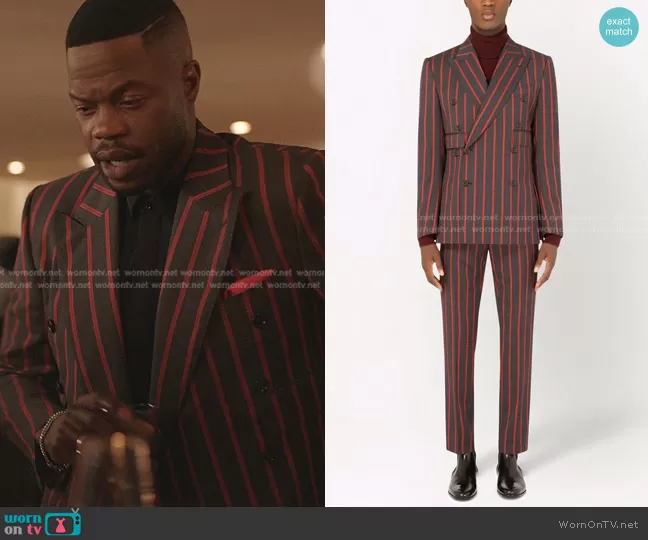 Jeff Colby (played by Sam Adegoke) on Dynasty on The CW was spotted wearing this red and black striped blazer on Dynasty on episode 'Vicious Vendetta' (5x14) in Jun 2022. Jeff's Suit Set is the Double-Breasted Pinstripe Wool Suit by Dolce & Gabbana.
