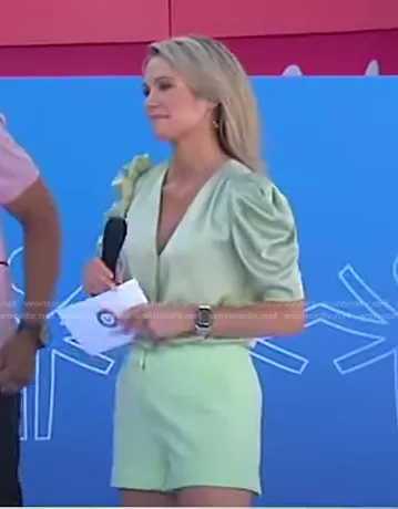 Amy Robach on Good Morning America on ABC was spotted wearing this mint green puff sleeve top and shorts on Good Morning America on Jun 06 2022's episode. Amy's Bodysuit is the Lila Bodysuit by Adelyn Rae . Amy's Shorts is the Elaine Shorts by Cinq a Sept.