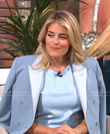 on E! News on E! was spotted wearing this blue dress and double breasted blazer on E! News Daily Pop on Jun 03 2022's episode. 's Dress is the Scallop Shift Minidress by Lisa Marie Fernandez . 's Jacket is the Panelled Double-Breasted Blazer by Stella McCartney.