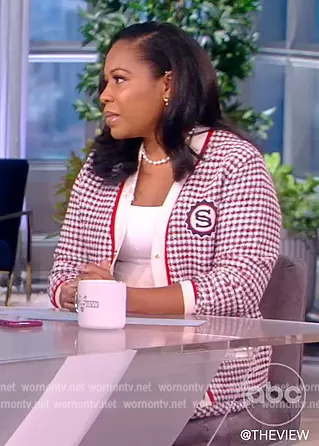 on The View on ABC was spotted wearing this tweed cardigan and skirt on The View on Jun 08 2022's episode. 's Sweater is the Rizee Printed Cardigan by Sandro