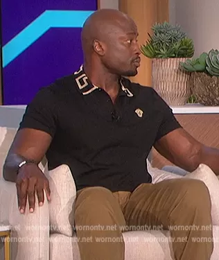 Akbar Gbajabiamila on The Talk on CBS was spotted wearing this black polo on The Talk on Jun 08 2022's episode. Akbar's Shirt is the Baroque Collar Polo Shirt by Versace.