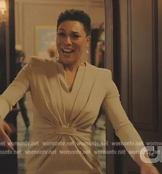 Lorraine Swift (played by April Parker Jones) on Tom Swift on The CW was spotted wearing this beige twisted front dress on Tom Swift on episode 'And the Liftoff to Saturn' (1x01) in May 2022. Lorraine's Dress is the Draped Milano-Stitch Midi Dress by Giorgio Armani.