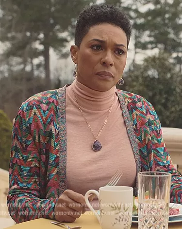 Lorraine Swift (played by April Parker Jones) on Tom Swift on The CW was spotted wearing this chevron cardigan on Tom Swift on episode 'And the Liftoff to Saturn' (1x01) in May 2022. Lorraine's Sweater is the Jacquard Optical-pattern lurex long cardigan by Valentino.