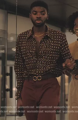 Tom Swift (played by Tian Richards) on Tom Swift on The CW was spotted wearing this gold buckle belt on Tom Swift on episode 'And the Liftoff to Saturn' (1x01) in May 2022. Tom's Shirt is the Printed Shirt by Dries Van Noten . Tom's Belt is the Smooth Reversible Belt with Shiny Goldtone Double Gancini Buckle by Salvatore Ferragamo.