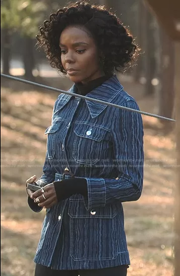 Zenzi Fullington (played by Ashleigh Murray) on Tom Swift on The CW was spotted wearing this blue striped belted jacket on Tom Swift on episode '...And the 4b Curl' (1x02) in Jun 2022. Zenzi's Jacket is the Wave-Print Belted Safari Denim Jacket by Marni.