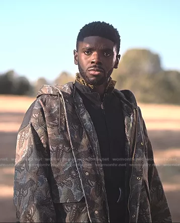 Tom Swift (played by Tian Richards) on Tom Swift on The CW was spotted wearing this moth print hooded coat on Tom Swift on episode '...And the 4b Curl' (1x02) in Jun 2022. Tom's Coat is the Graphic-Print Rain Jacket by Undercover.