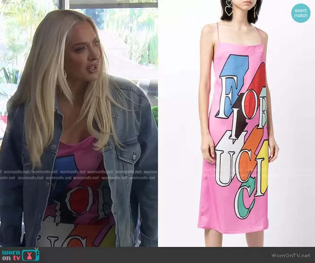 Erika Jayne on The Real Housewives of Beverly Hills on Bravo was spotted wearing this pink logo print dress on The Real Housewives of Beverly Hills on episode 'In Hot Water' (12x05) in Jun 2022. Erika's Dress is the Flying-Logo Midi Slip Dress by Fiorucci.