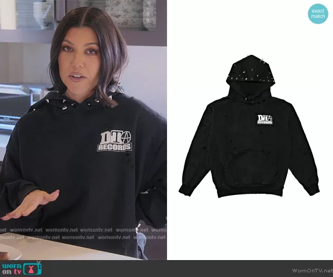 Kourtney Kardashian (played by Kourtney Kardashian) on The Kardashians on Hulu was spotted wearing this black studded trim hoodie on The Kardashians on episode 'Bucket List Goals' (1x09) in Jun 2022. Kourtney's Sweater is the Studded Hoodie by DTA Records.