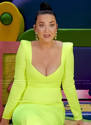 on E! News on E! was spotted wearing this yellow sweetheart long dress on E! News Daily Pop on Jun 09 2022's episode. 's Dress is the Bray Strong-Shoulder Thigh-Slit Gown by Alex Perry.