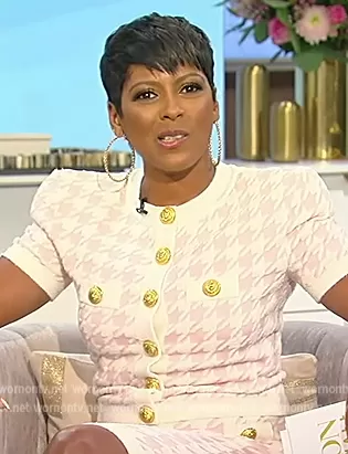 Tamron Hall on Tamron Hall Show on ABC was spotted wearing this pink houndstooth top and skirt on Tamron Hall Show on Jun 09 2022's episode. Tamron's Top is the Cropped houndstooth jacquard-knit cardigan by Balmain . Tamron's Skirt is the Houndstooth midi skirt by Skirt by Balmain.