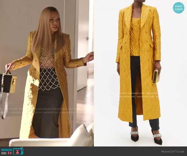 Dominique Deveraux (played by Michael Michele) on Dynasty on The CW was spotted wearing this yellow coat and bag on Dynasty on episode 'Do You Always Talk to Turtles' (5x13) in May 2022. Dominique's Coat is the Fion Tailored Floral-Cloqué Coat by Emilia Wickstead . Dominique's Bag is the Vintage Vanity Case Caviar Small by Chanel.