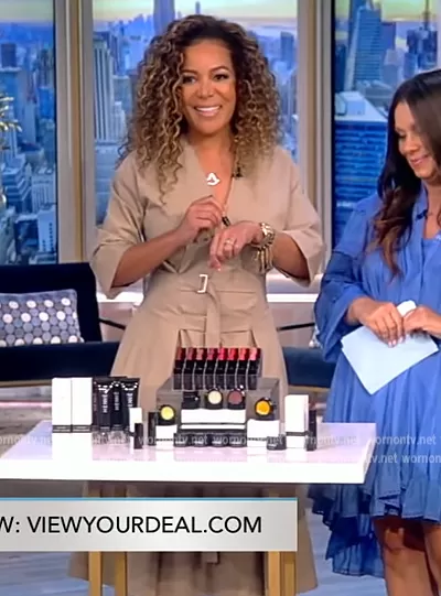 Sunny Hostin on The View on ABC was spotted wearing this khaki belted detail dress on The View on Jun 10 2022's episode. Sunny's Dress is the Buckle Cotton Midi Dress by Loewe.