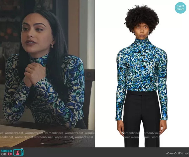 Veronica Lodge (played by Camila Mendes) on Riverdale on The CW was spotted wearing this blue floral mesh top on Riverdale on episode 'American Psychos' (6x17) in Jun 2022. Veronica's Top is the Hortensia Acid Flow Top by Paco Rabanne.