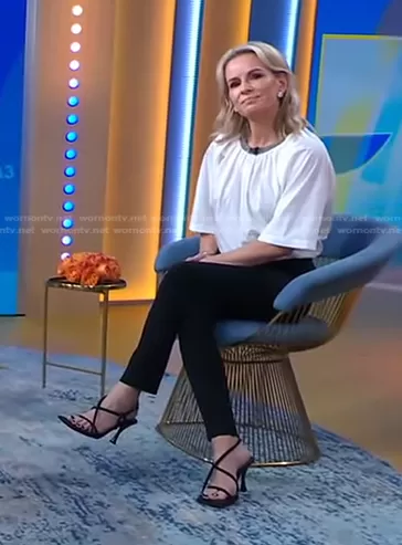 Dr. Jennifer Ashton on Good Morning America on ABC was spotted wearing this white jewel neck blouse on Good Morning America on Jun 09 2022's episode. Jennifer's Top is the Cotton Short-Sleeve Blouse by Brunello Cucinelli . Jennifer's Shoes is the Satin Strappy Sandals by Proenza Schouler.