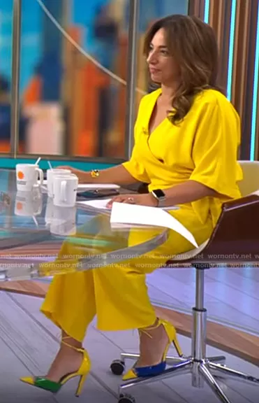 Michelle Miller on CBS Mornings on CBS was spotted wearing this yellow jumpsuit on CBS Mornings on Jun 13 2022's episode. Michelle's Jumpsuit is the Kai Jumpsuit by Trina Turk . Michelle's Shoes is the Ovio Pump in Yellow Pat Stripe Multi by Jeffrey Campbell.