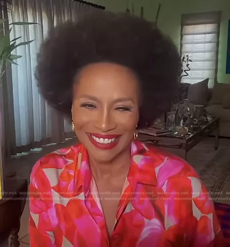 on Tamron Hall Show on ABC was spotted wearing this pink leaf print blouse on Tamron Hall Show on Jun 13 2022's episode. 's Top is the Leaf Print Cotton Peplum Button-Up Shirt by Akris Punto.