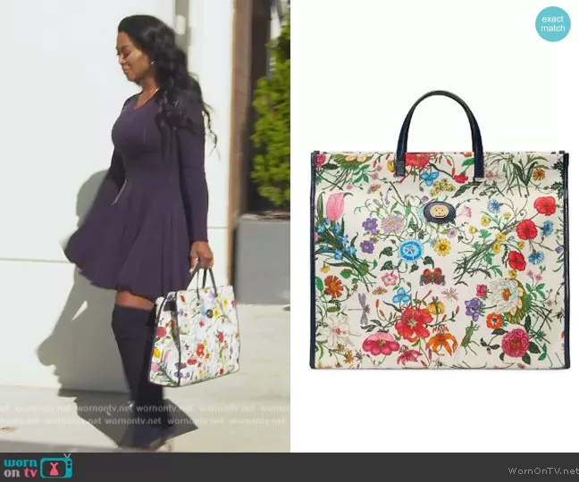 Kenya Moore on The Real Housewives of Atlanta on Bravo was spotted wearing this white floral tote on The Real Housewives of Atlanta on episode 'Don't Be Sea Salty' (14x06) in Jun 2022. Kenya's Bag is the Large Flora tote bag by Gucci.