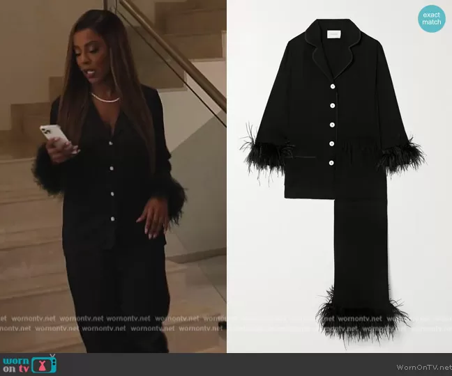 Caroline Brooks (played by Caroline Brooks) on The Real Housewives of Dubai on BravoTV was spotted wearing this black fur trim pajamas on The Real Housewives of Dubai on episode 'The G.O.A.T' (1x02) in Jun 2022. Caroline B's Pajamas is the + NET SUSTAIN feather-trimmed crepe de chine pajama set by Sleeper.