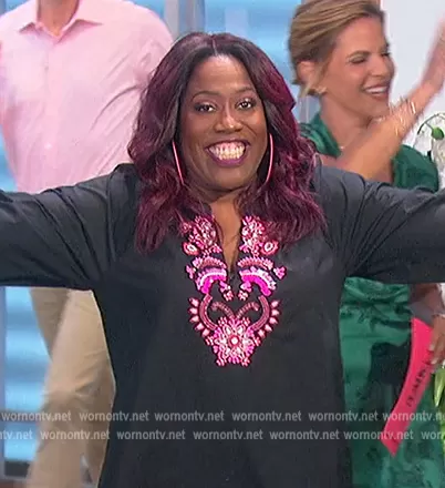 Sheryl Underwood on The Talk on CBS was spotted wearing this black embroidered tunic on The Talk on Jun 14 2022's episode. Sheryl's Top is the Ivy Top by Lilly Pulitzer.