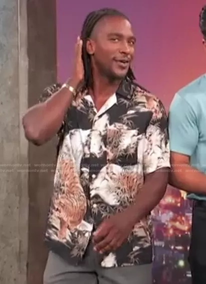 Scott Evans on Access Hollywood on NBC was spotted wearing this black tiger print shirt on Access Hollywood on Jun 15 2022's episode. Scott's Shirt is the Sumerian Printed Regular Fit Button Down Camp Shirt by All Saints.