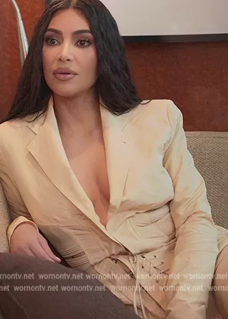Kim Kardashian (played by Kim Kardashian) on The Kardashians on Hulu was spotted wearing this beige lace-up detail blazer on The Kardashians on episode 'Enough Is Enough' (1x10) in Jun 2022. Kim's Suit is the Iconic Vintage Peach Corset-Inspired Pant Suit by Jean Paul Gaultier.