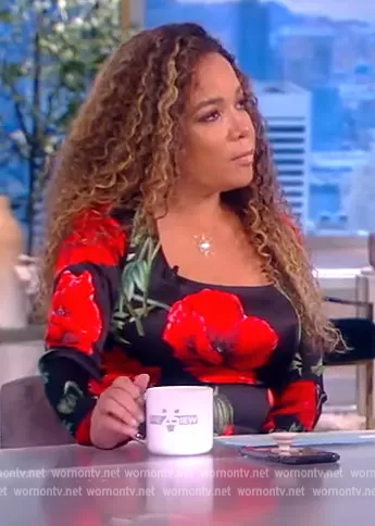 Sunny Hostin on The View on ABC was spotted wearing this black rose print midi dress on The View on Jun 16 2022's episode. Sunny's Dress is the Poppy Long-Sleeve Silk Midi Dress by Dolce & Gabbana.