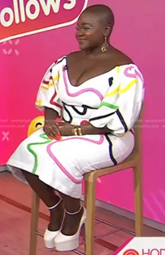 on Today on NBC was spotted wearing this v-neck dress with multicolor stripes on Today on Jun 17 2022's episode. 's Dress is the Namari Puff Sleeve Linen Blend Dress by Mara Hoffman . 's Shoes is the Tan-Go Platform Sandals by Valentino.