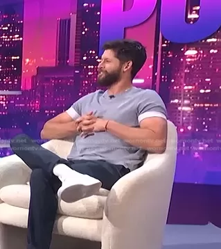 on E! News on E! was spotted wearing this grey tee on E! News Nightly Pop on Jun 16 2022's episode. 's Shirt is the Pique Crewneck Tee with Contrast Cuffs by ATM Anthony Thomas Melillo.