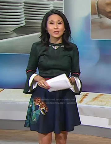 Vicky Nguyen on Today on NBC was spotted wearing this green and blue leopard print dress on Today on Nov 25 2025's episode. Vicky's Dress is the Emileen Floral Minidress by Ted Baker.
