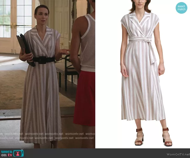 (played by ) on The Summer I Turned Pretty on Amazon Prime was spotted wearing this striped belted dress on The Summer I Turned Pretty on episode 'Summer Catch' (1x05) in Jun 2022. 's Dress is the Striped Collared Maxi Dress by Calvin Klein.