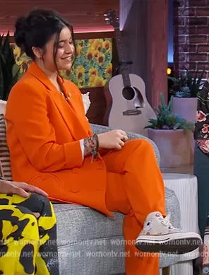 on The Kelly Clarkson Show on NBC was spotted wearing this orange double breasted blazer on The Kelly Clarkson Show on Jun 21 2022's episode. 's Blazer is the Cool & Easy Everynight Blazer by Blaze Milano . 's Pants is the Cool & Easy Basque Pants by Blaze Milano.