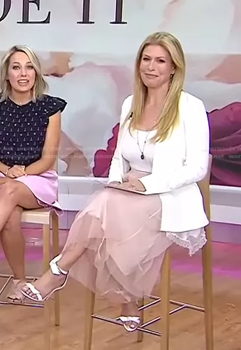 Jill Martin on Today on NBC was spotted wearing this white lace trim blazer and sandals on Today on Jun 21 2022's episode. Jill's Jacket is the Allie Crepe Lace Trim Blazer by Jonathan Simkhai . Jill's Shoes is the Clarita Leather Sandals by Alexandre Birman.