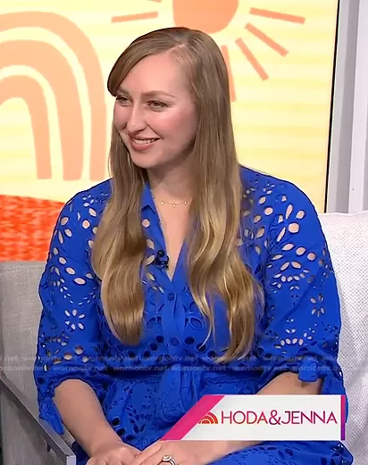 on Today on NBC was spotted wearing this blue eyelet shirtdress on Today on Jun 21 2022's episode. 's Dress is the Amrita Tie Waist Long Sleeve Midi Dress by Lilly Pulitzer.