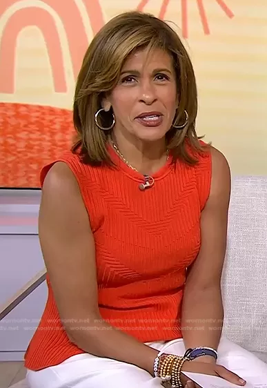 Hoda Kotb on Today on NBC was spotted wearing this red ribbed peplum top on Today on Apr 05 2024's episode. Hoda's Sweater is the Sleeveless Peplum Sweater by Halogen.