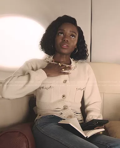 Zenzi Fullington (played by Ashleigh Murray) on Tom Swift on The CW was spotted wearing this ivory embellished cutout cardigan on Tom Swift on episode '...And the Chocolate Cowboys' (1x04) in Jun 2022. Zenzi's Sweater is the Slashed Cardigan by Area.