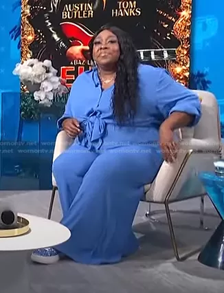 Loni Love on E! News on E! was spotted wearing this blue tie front jumpsuit on E! News Daily Pop on Jun 23 2022's episode. Loni's Jumpsuit is the About That Pant Set 30 by Fashion Nova.
