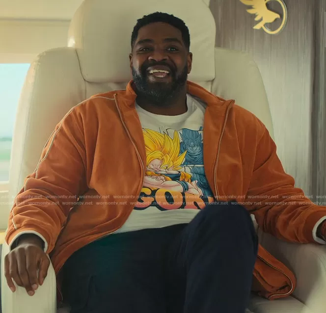 Howard (played by Ron Funches) on Loot on Apple was spotted wearing this Goku t-shirt and orange velour jacket on Loot on episode 'Bienvenidos a Miami' (1x02) in Jun 2022. Howard's Shirt is the Dragon Ball Z Graphic Tee by Forever 21 . Howard's Jacket is the Burnt Orange Velour Tracksuit Jacket by Sweatsedo.