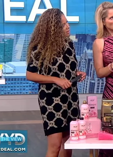 Sunny Hostin on The View on ABC was spotted wearing this black mini polo dress on The View on Jun 24 2022's episode. Sunny's Dress is the Reversible Interlocking G polo dress by Gucci.
